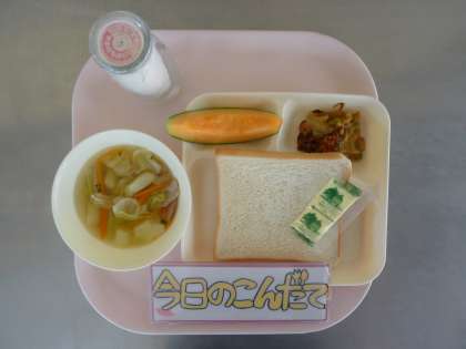 6月1日(水)の献立は「カレードリア・キャベツのスープ・クインシーメロン・食パン・マーガリン・牛乳」でした。年に1回登場するクインシーメロンが出ました。クインシーメロンは、皮に網目模様があり、果肉は赤肉系で、甘みのあるメロンです。食べごろでおいしかったです。
