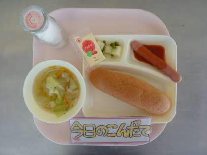 6月3日(金)の献立は「ウインナーのケチャップソース・スープ・じゃがいもと三度豆のサラダ・ライ麦パン・牛乳」でした。サラダにはマヨネーズが一人一袋つき、自分でかけて食べました。ライ麦パンにウインナーをはさんで食べている子どももいました。