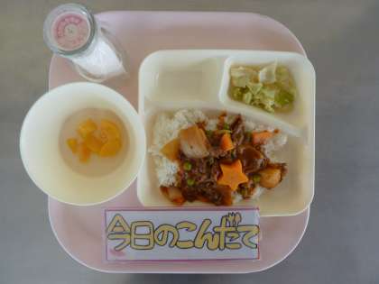 6月6日(月)の献立は「ハヤシライス・キャベツのゆずドレッシング・黄桃(缶)・牛乳」でした。給食室でブラウンルウを作って作るハヤシライスは子どもに人気の献立でした。今回の黄桃(缶)は食べやすいように一口にカットされていました。