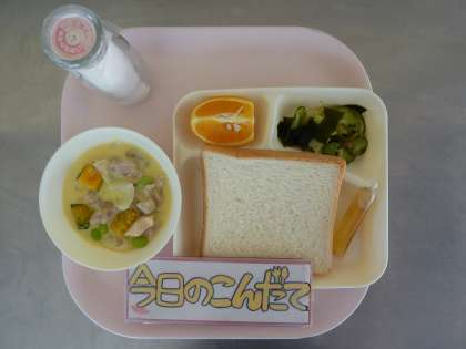 6月10日(金)の献立は「かぼちゃのクリームシチュー・ミックス海そうのサラダ・オレンジ・食パン・はちみつ・牛乳」でした。旬のかぼちゃが入ったクリームシチューは、バターとサラダ油を使用したルウを作り使用しました。コクのあるシチューに仕上がっていました。