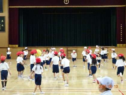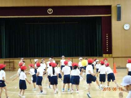 今日は雨だったので、1年生は講堂で体育の学習をしました。
