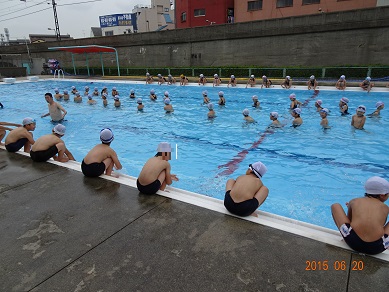 今日はプール開きでした。少し曇り空でしたが、気温・水温も基準値を超え、プールに入ることができました。