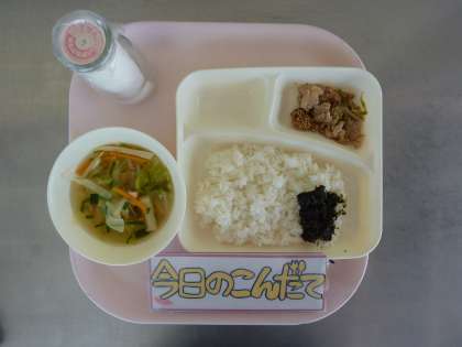 6月27日(月)の献立は「豚肉のごまみそ焼き・すまし汁・のりのつくだ煮・ごはん・牛乳」でした。ごはんがすすむのりのつくだ煮はかつおぶし(砕片)としいたけ、きざみのりを材料に調味料を加えて給食室で作りました。手作りのつくだ煮は子どもに人気でした。