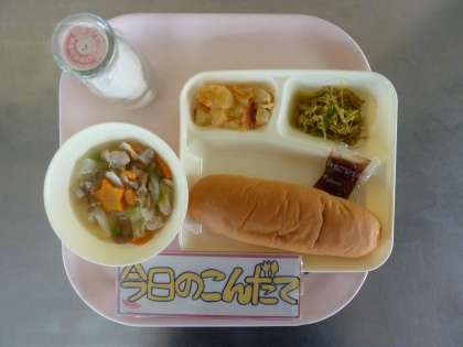 6月28日(火)の献立は「鶏肉と野菜のスープ煮・カレーソテー・りんごのクラフティ・コッペパン・いちごジャム・牛乳」でした。りんごのクラフティは写真右のようにミニバットに人数分の生地を入れて焼き物機で焼き上げました。給食では人気の手作りお菓子です。