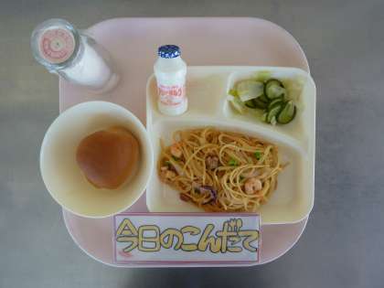 7月1日(金)の献立は「シーフードトマトスパゲッティ・グリーンサラダ・はっ酵乳・1/2黒糖パン・牛乳」でした。今が旬の生のトマトが入ったえび、たこ、ベーコンを主材にしょうゆ味のスパゲッティに仕上げました。残食なく食べてくれました。