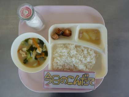7月11日(月)の献立は「さけのつけ焼き・みそ汁・とうがんの煮もの・ごはん・牛乳」でした。さけはごはんのすすむ一品でした。今が旬のとうがんの煮ものはやさしい味つけで子どもたちもしかっり食べていました。