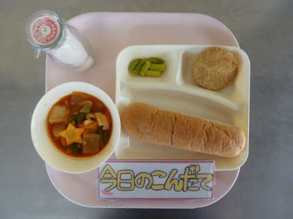 7月15日(木)の献立は「チキンレバーカツ・ケチャップ煮・グリーンアスパラガスのサラダ・ライ麦パン・牛乳」でした。不足しがちな鉄分やビタミンAを多く含んだ鳥のレバーが入ったチキンレバーカツは、ほんのりとカレー味がつき子どもに人気がありました。ケチャップ煮は、今学期最後のラッキー人参献立でした。