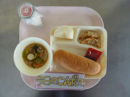 9月14日(水)の献立は「中華煮・あげギョウザ・なし(豊水)・コッペパン・いちごジャム・牛乳」でした。中華煮はうずら卵が除去食の個別対応献立でした。あげギョウザは毎回子どもに人気の献立です。今回の梨は豊水がでました。