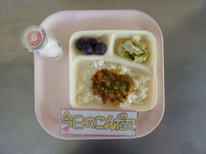9月15日(木)の献立は「ドライカレー[米粉]・グリーンサラダ・ぶどう(巨峰)・牛乳」でした。本日のドライカレーは米粉を使用したカレールウを使い小麦粉除去の子も食べれる献立でした。デザートに旬の巨峰がでました。ドライカレーも巨峰も子どもには大人気で完食でした。