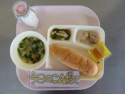 9月26日(月)の献立は「鶏肉のからあげ・とうがんの中華スープ・キャベツと三度豆のごまあえ・コッペパン・アプリコットジャム・牛乳」でした。子どもたちに大人気のからあげと今年最後のとうがんが入ったスープに練りごまの味がおいしいごまあえがでました。