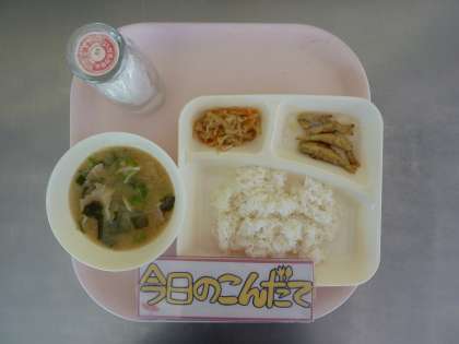 9月30日(金)の献立は「いわしのてんぷら・みそ汁・切り干しだいこんのいため煮・ごはん・牛乳」でした。骨まで食べれるいわしのてんぷらは高学年の児童に特に人気でした。また最近食べることの少なくなった乾物の切り干しだいこんなどは子どもにぜひ食べてほしい一品です。