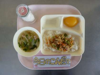 10月5日(水)の献立は「ピり辛丼・中華スープ・黄桃(缶)・牛乳」でした。ピリ辛丼は豚肉とたまねぎ、たけのこ、にんじん、ピーマンとたっぷりな野菜をトウバンジャンで辛みをつけて中華風に炒めた具をごはんにかけて食べました。子どもに人気の献立でした。黄桃(缶)も人気で残食なく食べてくれた献立でした。