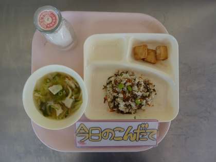 10月6日(木)の献立は「もずくと豚ひき肉のジューシー・五目汁・あつあげのしょうがじょうゆかけ・ごはん・牛乳」でした。ジューシーとは沖縄の方言で「炊き込みご飯」や「雑炊」のことをいい、今回は沖縄らしく、もずくと豚ひき肉、こんぶといろどりに枝豆を加えて作った具をごはんに混ぜて食べました。