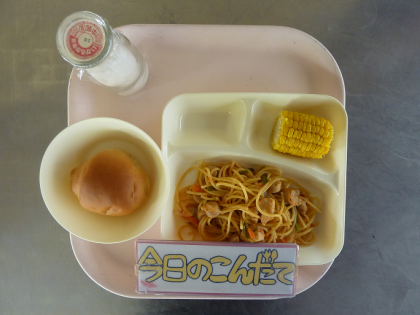 11月9日(水)の献立は「チキントマトスパゲッティ・蒸しとうもろこし・1/2黒糖パン・牛乳」でした。バジルとオリーブ油が効いたチキンとウインナーが主材のトマトスパゲッティは子どもに大人気でした。それに好きな子が多いカットコーンがつきました。