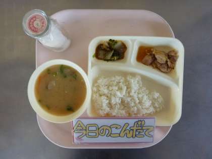 12月2日(金)の献立は「鶏肉の甘辛焼き・さつまいものみそ汁・きくなとはくさいのごまあえ・ごはん・牛乳」でした。豚肉にさつまいも、ごぼうなどの具がたっぷり入った豚汁のような体が温まるみそ汁でした。それに旬のきくなとはくさいのごまあえがでました。