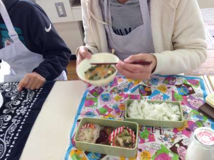 2学期2回目の調理実習は、お弁当づくりをしました。各グループで選んだ、お弁当に入れるおかずを調理しました。自分でお弁当をつくる経験があまりない子どもたち。。それでもグループのメンバーと協力して、楽しく、おいしく調理することができました。この経験を活かして、ぜひ次回、自分でお弁当をつくってほしいです。