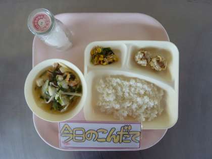 12月16日(金)の献立は「あげシュウマイ・えびととうふのスープ・ツナとチンゲンサイのいためもの・ごはん・牛乳」でした。あげシュウマイとツナとチンゲンサイのいためものは大好評でどのクラスも完食でした。今回の「えびととうふのスープ」はえびアレルギーの子どもの個別対応献立になっていました。