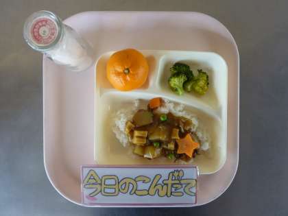 12月19日(月)の献立は「冬野菜のカレーライス・ブロッコリーのサラダ・みかん・牛乳」でした。今日のカレーライスはだいこん、れんこんが入った、年に一回の冬野菜を使ったカレーライスでした。牛肉もたっぷり入ったカレーは大好評でした。それに旬のブロッコリーのサラダと和歌山県産のみかんがつきました。