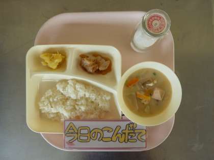 1月31日(火)の献立は「鶏肉の甘辛焼き・かす汁・くりきんとん・ごはん・牛乳」でした。日本の伝統的な食べ物であるかす汁がでました。体がとても温まりました。それに、おせち料理の一品であるくりきんとんがでました。「おいもの味がする〜」との声が聞こえ、「くりきんとんの材料はくりとさつまいもだよ」と説明しました。