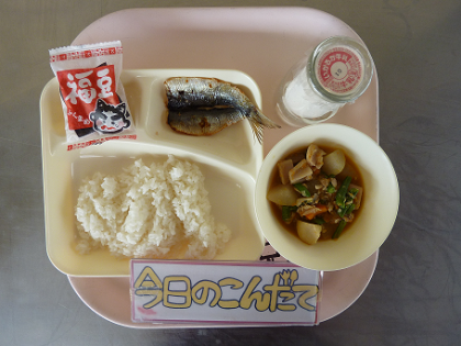 2月2日(木)の献立は「いわしのしょうがじょうゆかけ・含め煮・いり大豆・ごはん・牛乳」でした。一日早いですが、開きのいわしを焼き物機で焼きしょうがじょうゆをかけたものと、いり大豆のは節分行事献立がでました。開きのいわしだったので子どもにも食べやすかったようでした。
