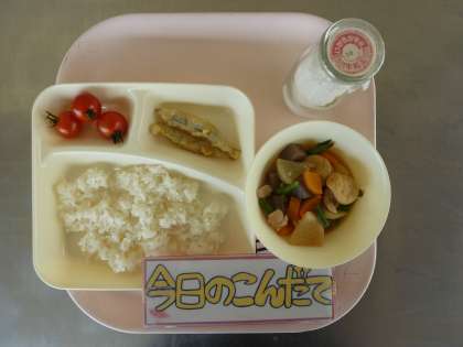 2月3日(金)の献立は「きびなごのてんぷら・一口がんもとだいこんの煮もの・プチトマト・ごはん・牛乳」でした。きびなごのてんぷらはカリッとおいしく揚がり好評でした。それと、熊本県産のみずみずしいプチトマトが出ました