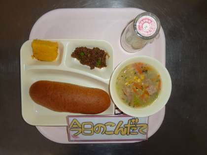 2月9日(木)の給食は「牛肉のデミグラスソース煮・コーンスープ・かぼちゃのプリン・ライ麦パン・牛乳」でした。今日の献立は子どもたちに大人気でした。かぼちゃのピューレと卵、牛乳、生クリーム、砂糖で作った程よい甘さのプリンは1年生の子たちにも大好評だったようでうれしかったです。