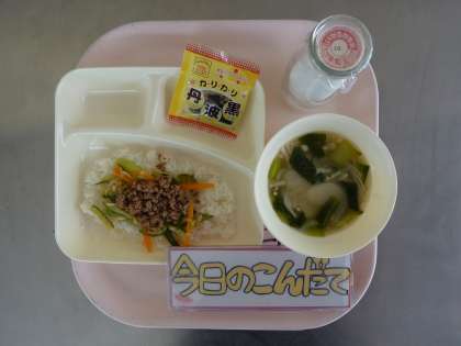 4月25日(火)の献立は「ビビンバ・トック・いり黒豆・牛乳」でした。韓国料理のビビンバとトックは人気の献立です。給食のビビンバの野菜は、季節にあった食材が使われています。今回のビビンバの野菜はきゅうり、にんじん、切り干しだいこんでした。