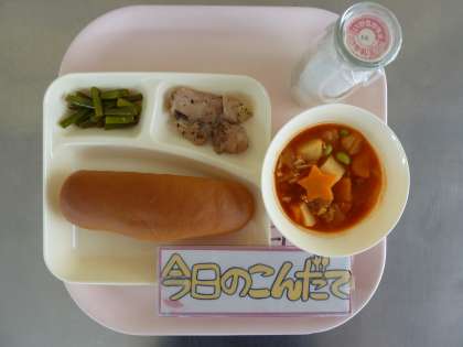 5月16日(火)の献立は「鶏肉のバジル焼き・ケチャップ煮・三度豆のソテー・黒糖パン・牛乳」でした。今日の三度豆のソテーは、生の三度豆を使っていたので歯ごたえのある仕上がりでした。給食を食べてる様子をのぞいてみると、3年生の教室ではパンにおかずをはさんで「おいしいよ!」と笑顔で食べていました。