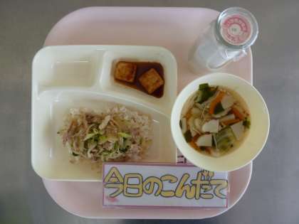 5月17日(水)の献立は「豚丼・五目汁・あつあげのしょうがじょうゆかけ・牛乳」でした。ダシのきいた五目汁は具だくさんで好評でした。給食にでる冷凍のあつあげは小ぶりですが、味よく子どもに人気の食材です。今日のあつあげのしょうがじょうゆかけは完食でした。