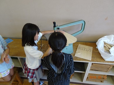 友だちと協力して、しっかり板をおさえて切ることができました。