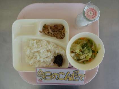 6月5日(月)の献立は「豚肉のごまみそ焼き・すまし汁・のりのつくだ煮・ごはん・牛乳」でした。給食室で作る手作りののりのつくだ煮は、子どもに人気の献立です。かつおぶし、しいたけ、きざみのりを調味料でことことと煮て作ります。手作りなのでやさしい味に仕上がっています。ごはんが進みます。