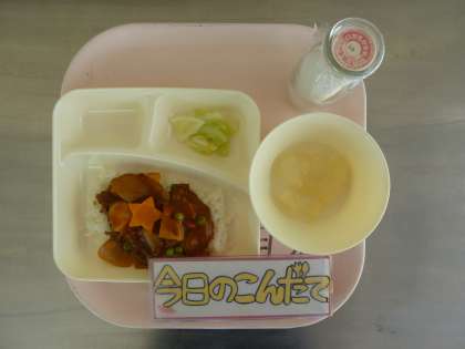 6月12日(月)の献立は「ハヤシライス・キャベツのゆずドレッシング・和なし(缶)・牛乳」でした。トマトピューレ、ケチャップ、デミグラスソースなどの調味料を使って作る手作りのハヤシライスは好評でした。「おかわりして、おなかいっぱい!おいしかった!」と言ってもらえました。和なしの缶詰もおいしく食べてもらえました。