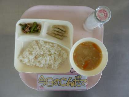 6月13日(火)の献立は「いわしてんぷら・みそ汁・豚肉と三度豆のいためもの・ごはん・牛乳」でした。いわしのてんぷらは骨まで食べるカルシウムいっぱいの一品でした。それに、旬の三度豆は湯がいてから、豚肉と一緒にいためました。生の三度豆を使った季節を感じる献立でした。