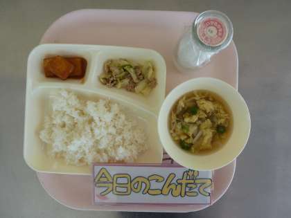 6月15日(木)の献立は「豚肉と野菜のいためもの・かきたま汁・あつあげのみそだれかけ・ごはん・牛乳」でした。今日のかきたま汁は、たまご除去の個別対応献立となっていました。赤みそ、砂糖、こい口しょうゆで作ったみそだれがかかったあつあげは人気の献立でした。