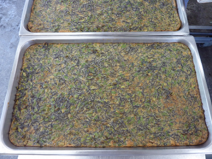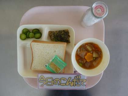 7月3日(月)の献立は「もずく入りヒラヤーチー・豚肉といかの煮もの・あっさりきゅうり・食パン・りんごジャム・牛乳」でした。ヒラヤーチーは沖縄の家庭料理で、お好み焼きやチヂミのようなもので、今回は沖縄らしくもずくを具材に入れました。給食では写真のように鉄板で焼き、一鉄板を32切れに切って配缶しました。