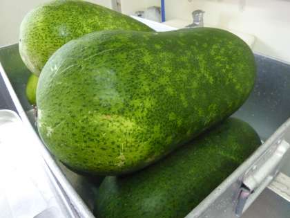 7月4日(火)の献立は「さけのさんしょう風味焼き・みそ汁・とうがんの煮もの・ごはん・牛乳」でした。夏が旬のとうがんが煮もので登場しました。写真のような大きなとうがんが6個納品され、430人分の優しい味つけの煮ものが作られました。