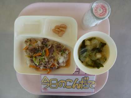 7月6日(木)の献立は「牛丼・すまし汁・大福豆の煮もの・牛乳」でした。牛丼は子どもたちが大好きな献立です。それに、家庭ではなかなか食べる機会の少ないおおふくまめの煮ものがでました。豆料理が苦手な子どももいますが、「甘くておいしい!」「増やしたよ!」と言ってくれる子どももいました。
