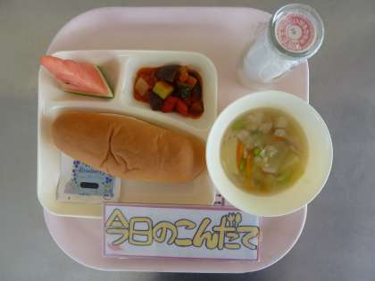 7月11日(火)の献立は「押し麦のスープ・夏野菜とベーコンのソテー・すいか・コッペパン・ブルーベリージャム・牛乳」でした。今日の献立には年一回しか登場しない赤ピーマンが入った夏野菜のソテーとすいかがでました。すいかは鳥取県産でした。給食のすいかは、一玉を64人分に切り分けてだしています。