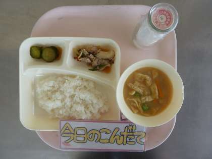 7月12日(水)の献立は「豚肉とピーマンのしょうが焼き・とうがんのみそ汁・きゅうりのピり辛あえ・ごはん・牛乳」でした。今月2回目のとうがんの登場でした。今回はたんざく切りにしたとうがんをみそ汁の具で使用しました。半透明でとろけるような食感に仕上がったとうがんのみそ汁は「今日のみそ汁おいしかったよ!」の感想が聞けた一品でした。