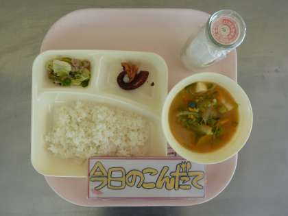 9月6日(水)の献立は「たこのやわらか煮・みそ汁・野菜いため・ごはん・牛乳」でした。たこのやわらか煮は一口大にカットされたたこを、砂糖、料理酒、みりん、こい口しょうゆでやわらかく煮ました。たこが好きな子どもと苦手な子どもに分かれた献立でしたが、苦手な子どもも少しは食べてくれていました。食べたらおいしかったということもあるので、まずは一口食べてほしいです。今日のみそ汁は、とうふ、かぼちゃ、たまねぎ、にんじん、青ねぎと具だくさんでしたが、「おいしかった!」と感想を言ってくれる子どもが何人もいました。