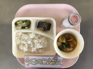 9月11日(月)の献立は「さごしの塩焼き・じゃがいもと一口がんもの煮もの・キャベツときゅうりのゆずの香あえ・ごはん・牛乳」でした。塩焼きにしたさごしは、骨も少なく子どもたちに食べやすい魚献立でした。今日は、和食の給食でした。