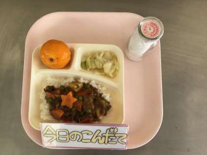 9月19日(火)の献立は「ビーフカレーライス[米粉]・キャベツのピクルス・みかん(冷)・牛乳」でした。今月は食物アレルギー対応サポート月間であり、今日のカレーライスのカレーのルウは小麦粉を使用していない米粉のルウを使った、小麦アレルギーの子どもも一緒に食べることのできるカレーライスでした。それに、ひんやり冷たい冷凍みかんがつきました。