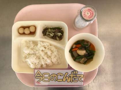 9月29日(金)の献立は「鶏肉とさといもの煮もの・牛肉と野菜のいためもの・みたらしだんご・ごはん・牛乳」でした。今日の給食は、お月見の行事献立でした。十五夜を「芋名月」ということや、さといもをお供えする風習が日本各地にあることにちなんで、さといもを使った煮ものと、月見だんごに見立てたみたらしだんごがでました。