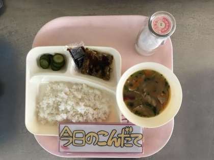 10月3日(火)の献立は「お好み焼き・豚汁・きゅうりの梅風味・ごはん・牛乳」でした。やまいもとろろを使用し、ふっくらと焼き上げたお好み焼きは、トンカツソースを自分でかけて食べました。ボイルしたきゅうりに、梅肉、砂糖、酢、うす口しょうゆで作ったタレをあえたきゅうりの梅風味は子どもたちに人気の献立でした。