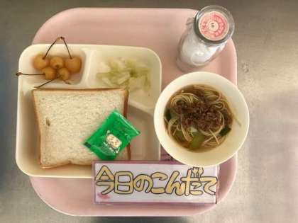 10月4日(水)の献立は「タンタンめん・キャベツの甘酢づけ・さくらんぼ(缶)・食パン・マーガリン・牛乳」でした。タンタンめんは、野菜とめんの入ったスープをよそった上に、ひき肉と白ねぎ,しょうがを炒めて味つけした具をトッピングしていただきました。