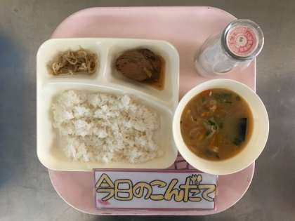 10月12日(木)の献立は「なまりぶしのしょうが煮・みそ汁・もやしのごまあえ・ごはん・牛乳」でした。なまりぶしは、かつおを蒸したり、ゆでたりしてから乾燥したものです。そのなまりぶしを、しょうがの千切りと一緒に甘辛く煮ました。それに具だくさんのみそ汁がでました。