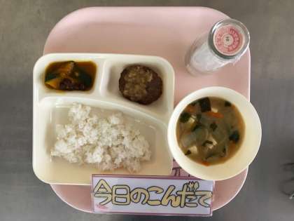 10月18日(水)の献立は「和風おろしハンバーグ・みそ汁・かぼちゃのいとこ煮・ごはん・牛乳」でした。あずきをやわらかく煮た後、味つけしたかぼちゃと合わせて煮含めた「いとこ煮」がでました。豆を食べることが苦手な子どもが多いなか、かぼちゃと合わせた献立なので、豆を食べることができた子どもが多かったです。