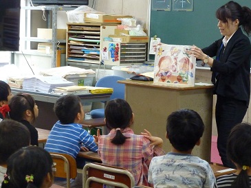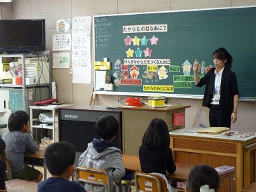今日は、1年生の教室に天下茶屋小学校から栄養教諭の先生が来てくださいました。
