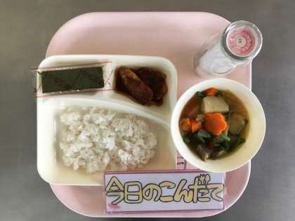 10月20日(金)の献立は「みそカツ・じゃがいもと野菜の煮もの・焼きのり・ごはん・牛乳」でした。給食室で、豚肉に衣、パン粉をつけて揚げた一口カツに、八丁みそ、赤みそ、砂糖、みりんで作ったたれをかけました。煮ものには、花の形にかたどったにんじんがまざっていました。
