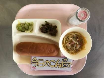 10月24日(火)の献立は「牛肉のカレー風味焼き・トマトのスープスパゲッティ・キャベツときゅうりのピクルス・黒糖コッペパン・牛乳」でした。生のトマトを使用し、ホタテのゆで汁も入った、トマトの酸味とほたて貝の風味がきいたスープスパゲッティでした。